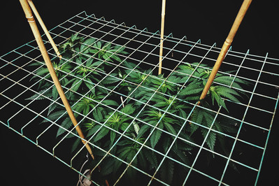 ScrOG: This entails a mesh screen with large enough apertures through which to feed cannabis leaves and branches. This can be made from commercial fencing wire or a plastic trellis, or made from wire or string and fixed to a frame. The purpose of the screen is to continually tuck under new growth into a flat sheet. What would have been undeveloped lateral branches with barely developed buds become healthy, stout branches with plenty of light exposure and their own dense flowers.