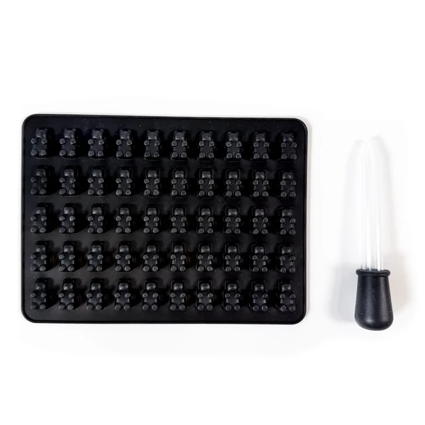 Gör jämna edibles med en enkel upphällning. Den här svarta silikonformen för gummibjörnar (en praktisk gummibjörnsform) är framtagen för att du ska kunna göra 50 likadana gummibjörnar per sats, så att storlek och form håller sig konsekventa för enklare portionering. Den levereras även med en praktisk dropper/pipett, så att du kan fylla varje formhål prydligt med mindre kladd och svinn.